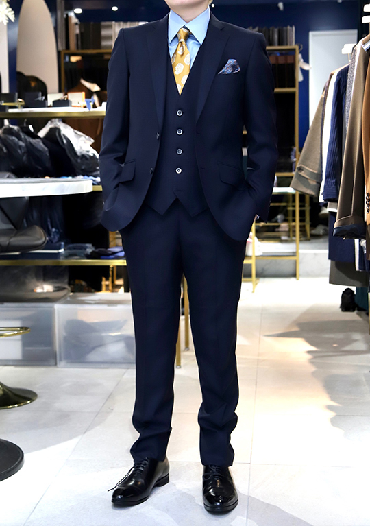 採寸当店はお客様の体型にフィットしたスーツを低価格でご提供できるイージーオーダースーツを採用しております。生地が決まりましたら、全身のを採寸し、実際にサンプルの衣装を着ていただき、お客様のイメージに近いサイズ感に合わせていきます。細身〜太めなどご希望のスタイルをお申し付けください。